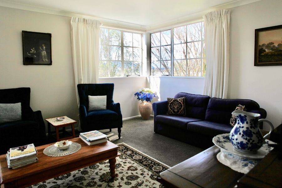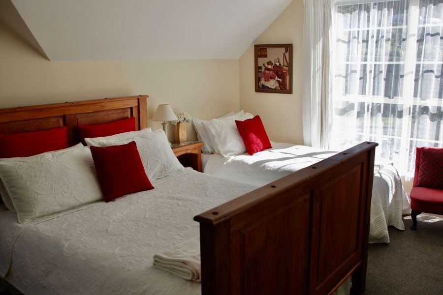 Spacious and luxurious, our suite is the ultimate room for those who love to spoil themselves!! Decorated in deep blue, and cream with a solid timber Queen sized bed, with crisp linen and extra pillows. Its size also allows for a lounge area with comfortable wing-back chairs and a television set to relax with in privacy. Tea and coffee making facilities are available in the room. An ensuite bathroom finishes the picture and adds to the total luxury. This is the ideal room for honeymooners or that romantic getaway weekend for two.
